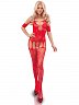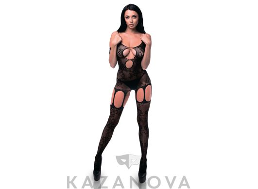 Комбинезон из мелкой и крупной сетки плотно облегает тело, подчеркивает грудь, тонкую талию и бедра, а также оставляет доступ к интимным зонам. Сетка имитирует корсет и чулки с поясом и пажами.
