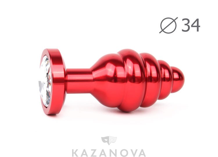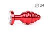 Втулка анальная металлическая средняя ребристая красная c прозрачным кристаллом
