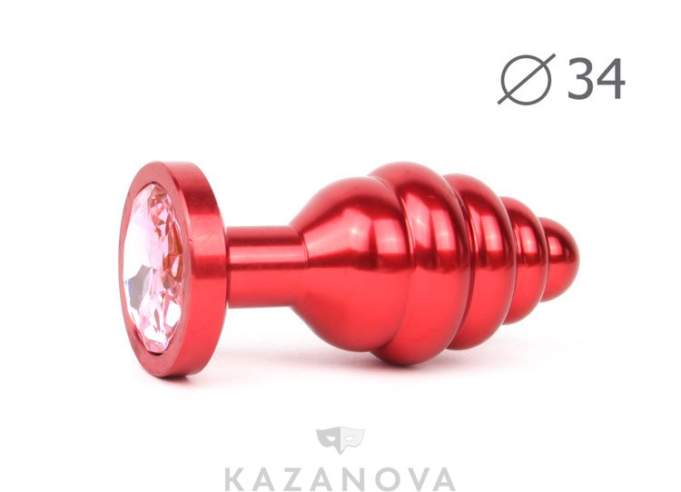 Втулка анальная металлическая средняя ребристая красная cо светло-розовым кристаллом